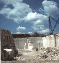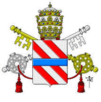 Many men were injured and few died during the construction of the fountain. In 1734 a stone-cutter was crushed by a large block of travertine. in 1736 a mason fell from the roof and died. In 1740 an apprentice slipped on the Travertine and passed away after many head lesions.The fountain is mostly built of travertine stone. The name of this stone derives from the Latin adjective tiburtinus, which means from Tibur, the actula city of Tivoli, about 22 miles (35 kilometers) East of Rome.The stone is a mineral consisting of a massive usually layered calcium carbonate formed by deposition from spring waters or especially from hot springs.Travertine was often used as a building material. The largest building in the world constructed mostly of travertine is the Colosseum in Rome. Other notable buildings using travertine extensively include the Sacré-Cœur Basilica in Paris and the Getty Center in Los Angeles, California. The travertine used in the Getty Center construction was imported from the same querries in Tivoli that supplied the stone for the Trevi Fountain.The Papal Crest on the attic is also made of travertine. It does not show the different colors of the Corsini Family Coat of Arms. Therefore the stonecutters used crosshatching to symbolize the various paints. For the blue in the horizontal band they used horizontal crosshatching. They used a vertical crosshatching for the three red oblique stripes. The background does not have any crosshatching...meaning silver. The crosshatching method used here follows a very popular convention in helarldy.Click here for the next curiosities page |
